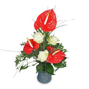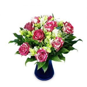Verzaubern Sie mit diesem kurz-rund gebundenen Strauß mit neun zweifarbigen rot-weißen Rosen und weißen Alstromerien.
