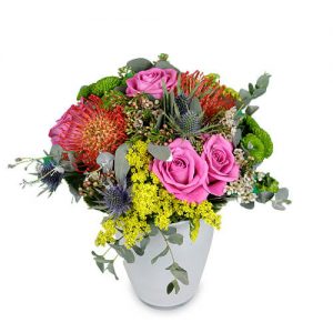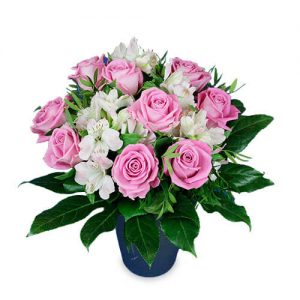 Für diesen Alstromerien Blumenstrauß verwenden wir neun rosa Rosen sowie verzweigte weiße Alstromerien und diverses frisches Schnittgrün wie beispielsweise frische Pistazienzweige.